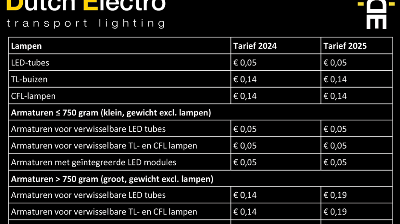 Vanaf 1 januari 2025 vindt er een wijziging plaats in de tarieven voor de wettelijke verwijderbijdragen van lampen en armaturen.